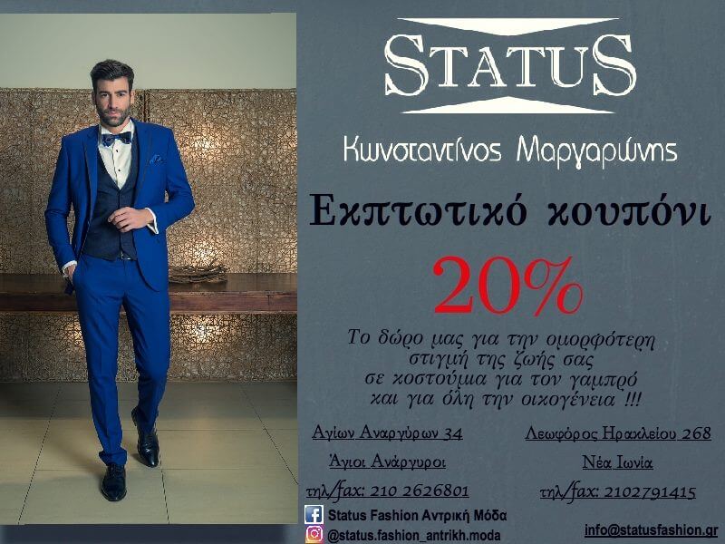 Τα καταστήματα Status Κωνσταντίνος Μαργαρώνης συγκαταλέγονται ανάμεσα στα πιο γνωστά ονόματα στο γαμπριάτικο ντύσιμο. Από το γαμπριάτικο κοστούμι μέχρι τα αξεσουάρ (γιλέκα, ζωνάρια, γραβάτες, παπούτσια κ.α.), ο γαμπρός θα βρει αυτό που του ταιριάζει στο στυλ και το ύφος του γάμου.
